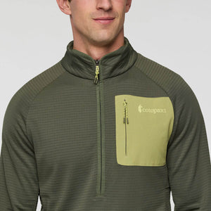 The Otero Half-Zip Pullover is a movement-friendly fleece with a fitted silhouette, a recycled polyester blend, a raised grid backing for added warmth and breathability, and concealed zippers. This technical fleece is ideal for cool weather hikes or other adventures.
